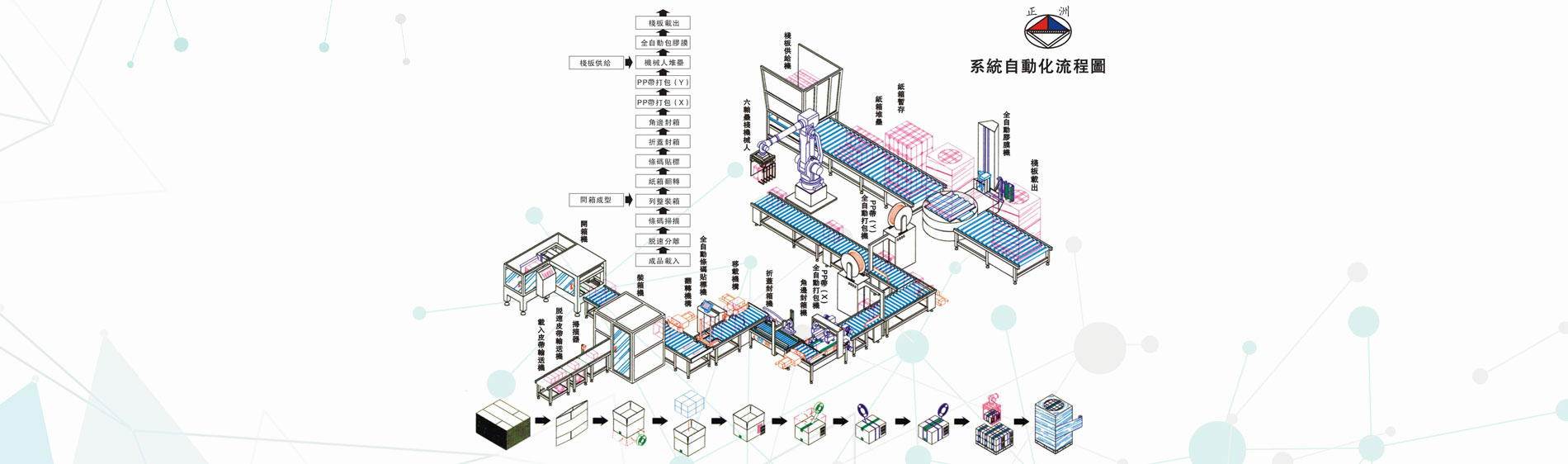 昆山正洲機電設備有限公司14年以來,堅持設計、制造、銷售、售后服務一條龍服務。生產經營范圍迅速擴大,形成以下產品系列: 自動封箱系列;自動打帶系列;自動封口熱收縮系列;棧板自動包裝系列;抽真空包裝系列;省力真空搬運系列;流水線輸送系列;自動貼標/套標系列;熱熔膠自動噴膠/貼合系統;進口手動打包工具系列;平面式裹包系列;自動倉儲系列;塑膠蓋自動封蓋系列等各種產品的無人化包裝系統的設計與制造。 公元1981年春,在莊志斌先生的帶領下,于桃園成立了一家專業生產自動化設備的工廠。主要生產后段包裝機械及PP打包帶,經過20多年的苦心經營已頗具規模,客戶達到3000多家。于2001年在廣東成立(東莞)工廠;2002年在江蘇成立昆山正洲機電設備有限公司(總部)。